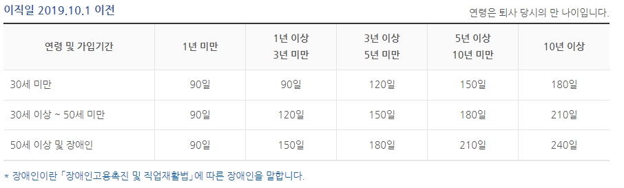(이직일이 2019.10.1 이전은 퇴직 전 평균임금의 50% × 소정급여일수)